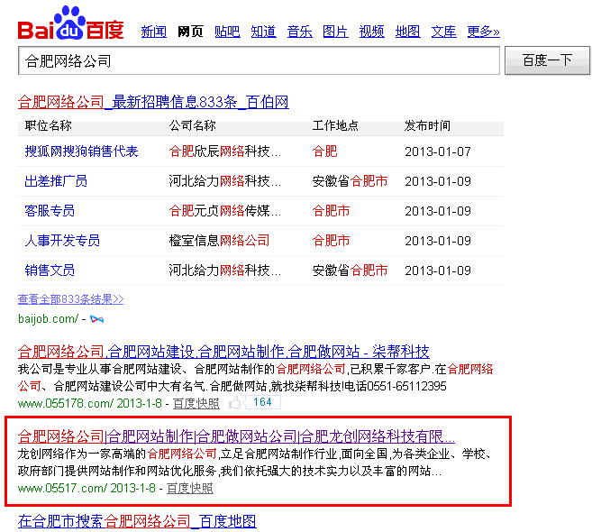 經過我公司技術人員的一致努力,目前,百度搜索“合肥網絡公司”一詞,我們的網站m.jianzhi168.com 已躍至百度排名第二位。以下是2013年1月8日的百度搜索截圖: